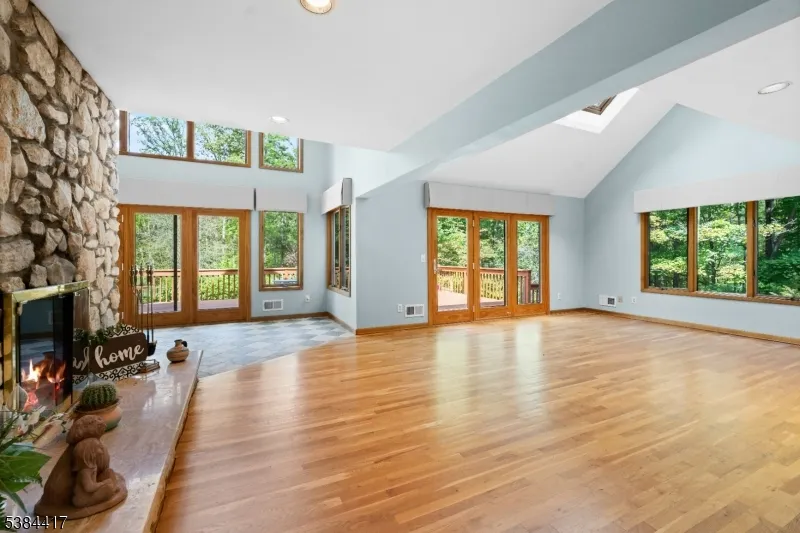 Welcome Home to Your Private Retreat. Step into this 5BR 5 full bath contemporary home w/circular driveway. This home has the 4,378 sq ft of living space w/ an open layout, soaring vaulted ceilings, and expansive windows. This home is filled with natural light and picturesque views from every angle. 1st floor offers a BR & full bath. Upstairs, you’ll find four spacious additional bedrooms, including an oversized bedroom above the garage and a primary suite with its own private deck, ideal for morning coffee or evening relaxation. This home is designed for both everyday living and entertaining. .Two-story kitchen dinette area and a huge center island topped w/ granite countertops, Sub-Zero refrigerator, 36-inch range, and vented hood. Dual-sided wood-burning fireplace between the kitchen and family room adds warmth and charm . Gleaming hardwood floors throughout. A wraparound porch and expansive deck overlooks the wooded yard. Finished basement with full bath for recreation, office, or guests .Oversized garage with plenty of storage. The inground swimming pool is surrounded by nature perfect for summer relaxation and entertaining.This property offers seclusion and tranquility in every direction. Whether you’re lounging by the poolside, gathering around the fireplace, or preparing meals at the expansive island, every day here feels like a vacation. Located in a highly rated school district, this home blends modern comfort with the peace and privacy of nature.