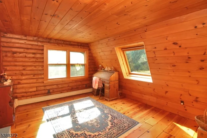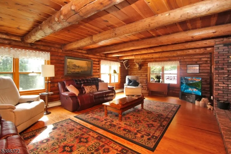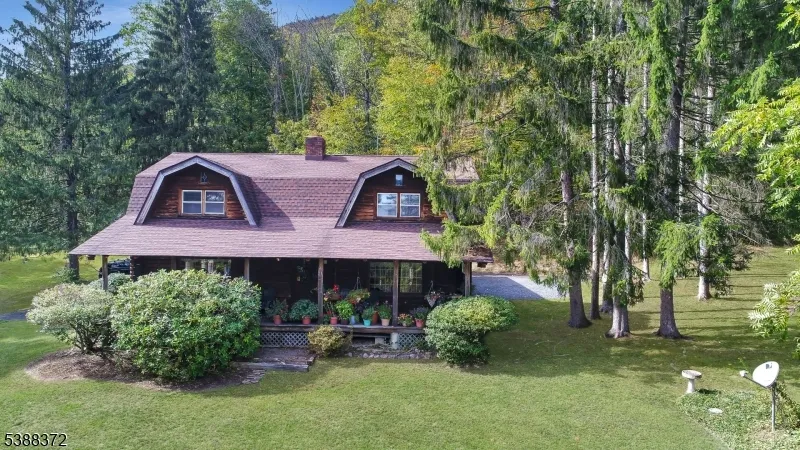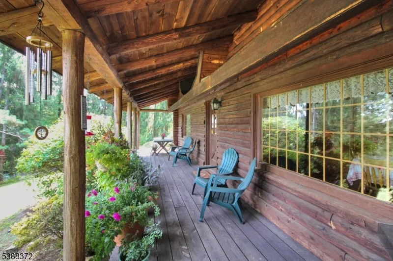 Welcome to your private log home retreat! Tucked away on over 6 acres and backing to thousands of acres of federal parkland within the Delaware Water Gap National Recreation Area, this handcrafted saddle notch solid timber home has been lovingly built and maintained by its original owner. Follow the long driveway to your secluded escape, where a classic rocking-chair front porch invites you to take in the wildlife and sweeping woodland views. Inside, the first floor features a bright kitchen open to the dining area, which flows into the family room with a stunning brick wood-burning fireplace and soaring timbers. A den, living room, and full bath complete this level. With its own entrance, this wing offers flexible space ideal for a home office or guest suite. Upstairs, discover 5 generously sized bedrooms, including a primary suite with private bath and balcony overlooking the forest. The spacious basement offers additional possibilities and connects to a two-car garage. The property itself is a haven with ample parking, open fields, and level land well-suited for horses, gardening, or a small hobby farm. Beyond the property, you can walk directly to the Catfish Fire Tower and the Appalachian Trail, offering endless outdoor adventure. With its oversized timbers, gleaming wood floors, and timeless craftsmanship, this home is a must-see for log home enthusiasts. All this, just a little over an hour from NYC, gives you the perfect blend of tranquility and accessibility.