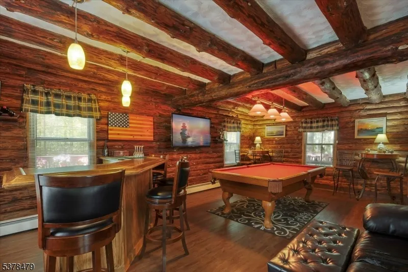 +"PublicRemarks": "Experience the unique opportunity to own this well-maintained log home, perfectly set on 2.2 acres of secluded land, offering exceptional privacy. Step inside to a passive solar room filled with natural light, seamlessly flowing into a cozy living room with a wood-burning stove. This inviting space extends to a wrap-around deck, where you can unwind in the hot tub. The deck and backyard create an idyllic setting for entertaining with summer BBQs or simply soaking in the tranquil surroundings. The generously sized kitchen is a chef's delight, featuring a breakfast bar, newly built butcher block island, and open layout to the dining area, perfect for gatherings. Additional living space is found in the billiard room, complete with a custom bar, ideal for hosting. This versatile home offers 2 kitchens, 4 bedrooms, 2 full baths, and a half bath. It can function as a spacious 4-bedroom residence or be adapted into a separate in-law suite with 2 bedrooms, bathroom, living room, kitchen, and private deck entrance. Modern comfort is ensured with 4-zone heating and 3-zone A/C. The property also includes a 2-car garage with workshop area, perfect for projects and storage. Recent updates include new roof (3 years), newer skylights, paved driveway, hot water heater, and new hot tub replaced August 2025. Located in sought-after Rockaway Township, this home offers the perfect blend of privacy and convenience near hiking, fishing, shopping, dining, top-rated schools, and Routes 80, 23 & 46."