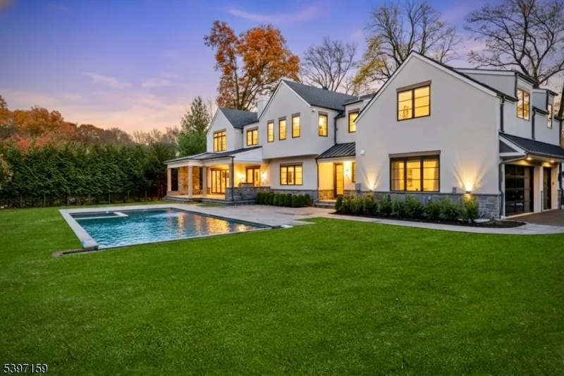 Blending privacy, sophistication, and lifestyle, this 7 BR 7.5 BTH estate sits on a rare private acre and offers 9500+ sq. ft. of custom designed living space. Soaring 10 foot ceilings on the main level and 9 foot ceilings above and below create an airy open feel. The chefs kitchen w/Sub Zero and Wolf appliances, dual dishwashers, oversized island, and bespoke cabinetry flows into a sun filled family room w/ double sided gas FP and wall of glass overlooking the landscaped property. A floating wine display defines the transition between the dining and LR, while the DR wet bar enhances effortless entertaining. A main level suite w/ radiant heated bath offers an ideal guest haven, and a first floor office provides elegant work from home space. Upstairs, five ensuite BR feature radiant heated baths. The primary suite is a serene retreat, showcasing a vaulted ceiling w/ exposed beam, gas fireplace, spa inspired bath, and custom closet with dual islands. An expansive bonus room offers flexible living, and the LNDRY is conveniently located on this level. The lower level includes a theater, wet bar, recreation area, gym, and additional BR w/ FBTH. Outside, a Gunite heated pool with spa and automatic cover, outdoor KIT, covered terrace w/ fireplace, large bluestone patio, and manicured fenced grounds create a private resort. Additional highlights include smart lighting, built-in speakers, 22kW generator, heated 3-car garage, and a separate storage structure ideal for a future cabana.