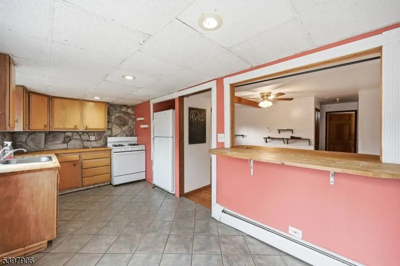 Cozy Ranch-Style Home with Cottage Kitchen, Bay Window & Lake Access. This inviting ranch-style home is ideal for first-time buyers or anyone seeking the ease of one-floor living. It offers 2 bedrooms, 1 full bathroom, and a bonus room that can serve as a home office, den, or guest space. The heart of the home is its cottage-inspired kitchen, showcasing a striking stone accent wall and a breakfast bar that creates a warm, welcoming space for meals and gatherings.A standout feature is the bay window overlooking the lake, filling the living area with natural light and offering serene views year-round.Step outside to enjoy the flat backyard with a spacious deck, perfect for entertaining, relaxing, or simply soaking up the outdoors.Blending classic ranch appeal with thoughtful updates, this property makes a wonderful starter home with room to grow.As part of the community, membership to Gordon Lakes in West Milford is required, providing access to beaches and docks a lifestyle perk that brings recreation and relaxation right to your doorstep.