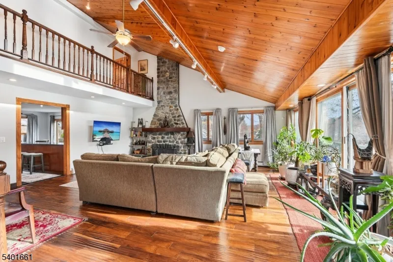 Rare lakefront rental on Upper Greenwood Lake offering breathtaking views, soaring ceilings, and exceptional architectural charm. This 3-bedroom, 2-full-bath home features an open-concept layout designed to maximize natural light and lake views from nearly every room. The main living area showcases dramatic vaulted wood ceilings, hardwood floors, and a striking stone fireplace, creating a warm yet expansive space ideal for both everyday living and entertaining. Walls of windows overlook the lake and open directly to a wraparound deck, perfect for enjoying sunrise coffee or evening sunsets over the water. The eat-in kitchen features high ceilings, abundant cabinetry, and easy access to outdoor dining, flowing seamlessly into the living area. The upper level includes a distinctive catwalk overlooking the living room, connecting the primary bedroom and second bedroom, which share a full bath. The primary bedroom offers a loft area currently used as a home office, along with additional attic storage. A third bedroom and second full bath on the first level provide flexibility for guests or additional living space. The home may be rented furnished for a turnkey lakefront lifestyle, or furnishings can be removed at tenant?s request. Dock usage is available for tenants who wish to enjoy boating and lake activities; association fees apply.