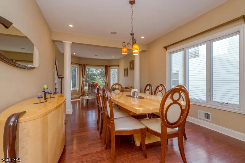 +"PublicRemarks": "East-facing colonial home featuring a classic brick front, paver driveway, and inviting walkway leading to a bright, open foyer with a stunning chandelier and abundant natural light. The main level offers 10-ft ceilings, a spacious LR and DR combo with HW flooring, accented by elegant columns that define each space with timeless appeal and enhanced by a built-in surround sound system. The gourmet kitchen features SS appliances, a center island with seating, a mini bar/butler pantry. Custom windows on the first floor enhance natural light throughout. Sliding doors open to a fully fenced backyard with a paver patio and lawn, perfect for outdoor enjoyment. The family room offers HW flr, classic columns, a step-down design adding architectural character, and a conveniently located powder room. The first floor hallway connects to the laundry and pantry area and provides direct access to a two-car garage. The second level overlooks the foyer and offers a spacious primary bedroom with 8+ foot ceilings and a luxurious en-suite bath featuring a stall shower, jacuzzi tub, and two closets. Three bedrooms feature large windows and ample closet space. A full hall bathroom includes a tub and a double vanity. The unfinished basement has nine-foot ceilings, offering excellent potential for future customization. The whole house has central vacuum. Ideally located near the GSP, NJT, 287 & 1, shopping, dining, and Metropark Train Station."