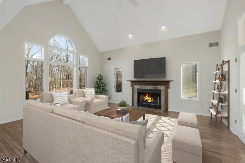 Set atop the highly sought-after Martinsville mountaintop section, this exceptional custom-built brick home offers privacy, elegance, and breathtaking views on 1.88 acres on a quiet cul-de-sac. An elongated blacktop driveway leads to a gracious front entry. Inside, a dramatic two-story marble foyer with sweeping staircase and arched doorways sets the tone for refined living. The formal living and family rooms feature soaring peak ceilings and custom French doors, perfect for both open flow and intimate gatherings. The expansive family room showcases a wood-burning fireplace, wall of windows, and seamless connection to the gourmet kitchen with granite island, five-burner range, walk-in pantry, separate dining area, and sliders to a deck with spectacular views. A Butler’s pantry with wet bar provides elegant access to the formal dining room. The main level also includes a private office or bedroom, full bath, and laundry room. Upstairs, the primary suite impresses with a vaulted ceiling, walk-in closet, and spa-like bath featuring jetted tub, dual vanities, and skylight. Three additional bedrooms with an adjacent full bath are on an additional level. The finished walk-out lower level is ideal for entertaining with a custom bar, full bath, and separate heating. Energy-efficient upgrades include owned solar panels, new heat pumps, newer roof, and mechanicals. A rare offering of luxury, comfort, and value this home is truly not to be missed.