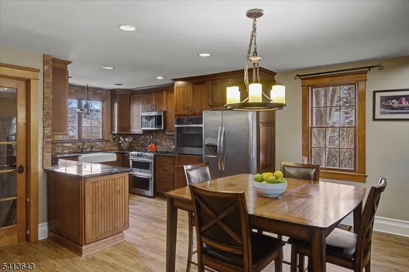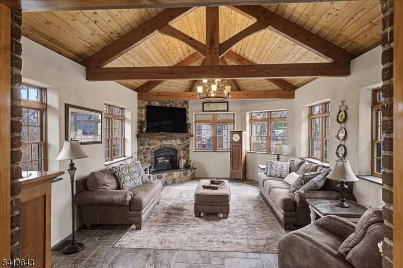 +"PublicRemarks": "Distinctive Tudor-style home on Aurora Street offering architectural character, quality construction, and extensive improvements over time. Originally built in 1959 and completely rebuilt in 2010 with additional kitchen and landscaping updates completed in 2020 and 2023, the home blends classic design with modern systems and thoughtful updates.Inside, the dramatic great room features vaulted wood ceilings with exposed beams and a stone fireplace, creating a striking focal point for everyday living and entertaining. Hardwood flooring runs throughout much of the home, and the flexible layout includes first-floor bedrooms and full bath for added versatility.Comfort is enhanced by radiant hydronic floor heating and multi-zone central air conditioning, while a concrete tile roof installed in 2010 adds durability and long-term value.Outdoor spaces include a private courtyard setting with mature trees and a charming garden shed, ideal for relaxing or entertaining. A rear alley provides access to a detached garage and private parking area with a gated entry designed to accommodate vehicle access.Located in Phillipsburg near the Delaware River and just minutes from downtown Easton, Lafayette College, restaurants, shops, and major commuter routes including Routes 22 and 78."