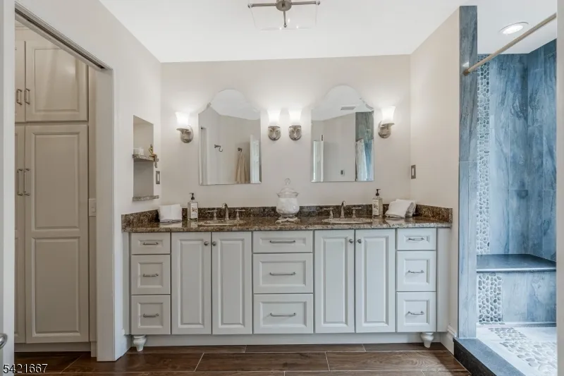 +"PublicRemarks": "Set high on a picturesque street in one of Stony Hill's most sought-after neighborhoods, this stunning home offers elegance, space, and thoughtful design throughout. A grand 2-story entry welcomes you into a sun-drenched interior featuring gleaming hardwood floors across the first level. Formal living & dining rooms with detailed millwork flank the foyer, creating a warm and refined first impression. A custom butler's pantry with a wine refrigerator leads into the beautifully renovated chef's kitchen, which features granite countertops, a 6-burner Wolf range, commercial-grade appliances and a separate dining area. The kitchen flows seamlessly into the spacious family room with tile flooring, a wood-burning fireplace, & sliding doors that open to a private patio. Enjoy outdoor living in the level, manicured backyard featuring a custom paver patio and outdoor fireplace perfect for entertaining. A powder room, mudroom, and direct access to the 3-car garage complete the main level. Upstairs, wrought iron railings and dual stair access enhance both style and function. The luxurious primary suite features double-door entry, a sitting area, two walk-in closets, and an updated spa-like bath with radiant heated floors and a walk-in shower. A separate wing offers two additional bedrooms and a full bath, while a fourth oversized en-suite bedroom includes its own walk-in closet, full bath, and laundry area. A full unfinished basement offers endless possibilities to customize and expand."