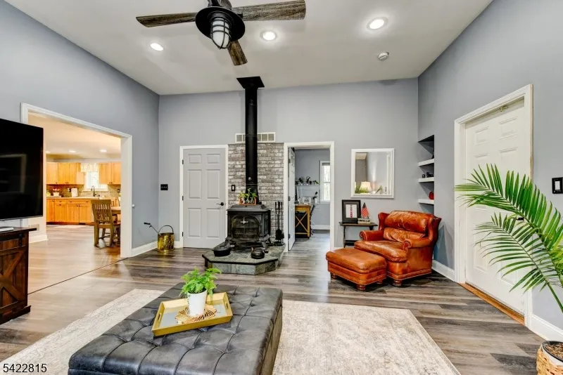 +"PublicRemarks": "Set on 1.9 acres of peaceful, private land, this beautifully maintained 2-bedroom, 2 1/2 bath ranch with a dedicated office that can easily be used as a third bedroom, offers a perfect blend of comfort and tranquility. The spacious eat-in kitchen with abundant cabinetry, and generous counter space, ideal for everyday living and entertaining. It flows seamlessly into a large living room highlighted by a cozy wood-burning stove perfect for creating a warm, inviting atmosphere during the colder months. Sliding doors from the kitchen lead to a rear deck overlooking the scenic backyard, wooded surroundings, and a stunning paver patio complete with a pergola and outdoor fireplace/barbecue an ideal setting for relaxing or hosting guests. The preserved Delaware & Raritan Greenway borders the property on the west side, enhancing the home's sense of privacy and natural beauty. Located in the highly desirable Hunterdon Central Regional High School district, this home also offers convenient access to major highways, as well as nearby destinations including Princeton, Flemington, and the charming river towns of Lambertville and New Hope. Additional features include a workshop area and additional storage area on side of garage."