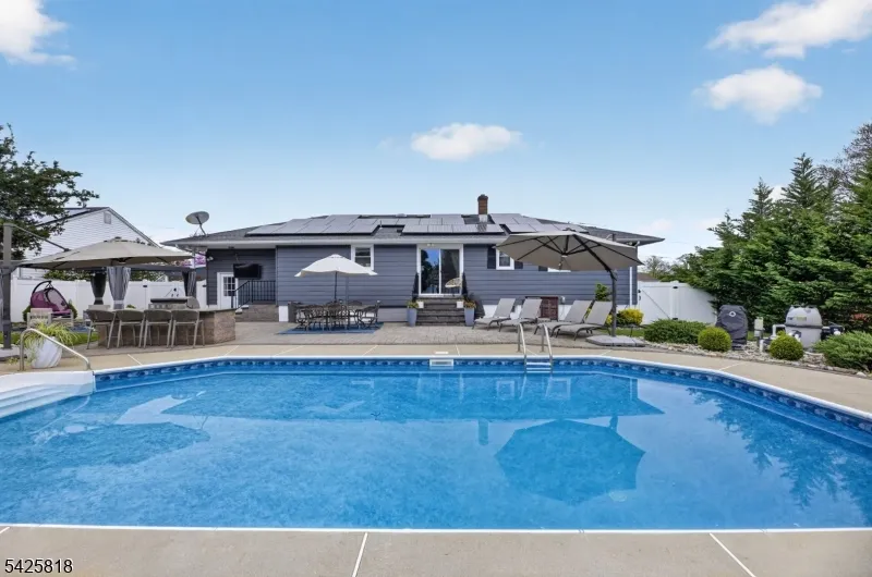 +"PublicRemarks": "Beautifully maintained 3-bedroom, 2.5-bath ranch in desirable North Brunswick offering approx. 1,400 sq ft plus a large, finished basement with potential for a 4th bedroom, office, gym, or rec room. The true highlight of this home is the incredible backyard designed for entertaining, featuring an in-ground pool, expansive paver patio, covered pergola lounge area, outdoor kitchen, multiple seating and dining spaces, and a large, fenced yard perfect for hosting summer gatherings or relaxing at home. The main level offers comfortable living space, updated baths, and a functional layout with warm, inviting finishes throughout. The finished basement adds valuable bonus space and flexibility for a variety of needs. Solar panels provide significant savings and the benefit of little to no electric bills. Conveniently located close to public transportation, major highways, shopping, dining, and everyday conveniences. Address is also eligible for charter school attendance. A rare opportunity to own a move-in ready home with exceptional outdoor living and great commuter access in one of North Brunswick's most convenient locations. Showings begin 4/25/26!"